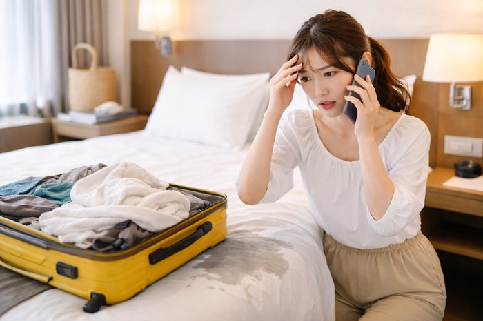 旅行や出張でホテルに到着し、ほっと一息ついた瞬間。